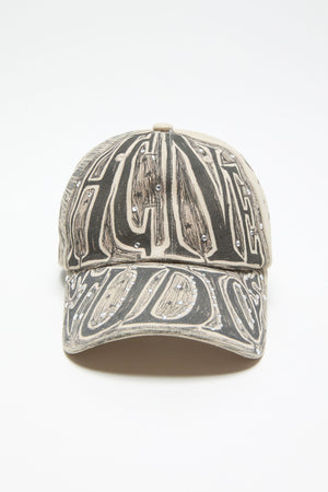 Baseball cap is crafted from cotton twill with a stonewash finish, adorned with a seasonal artwork print and crystal studs.