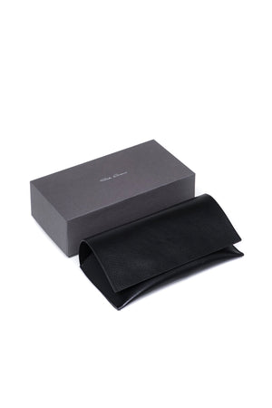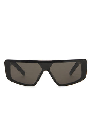 These performa sunglasses feature a slim geometric black nylon frame and a single cut lens. They have wide arms with the signature trio of silver riverts on each temple and Rick Owens logo on inside right.