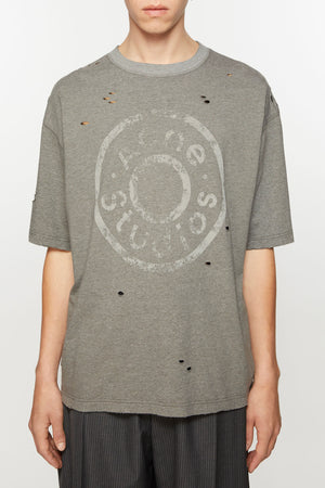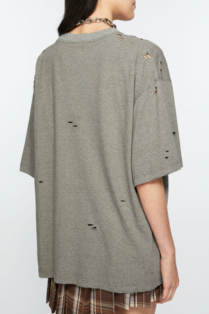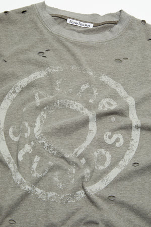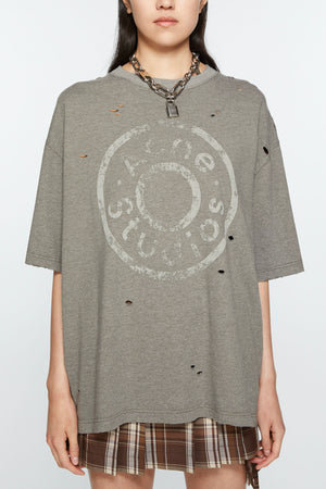 Crew neck t-shirt features a seasonal button logo printed animation and distressed details, crafted from a cotton blend with a garment-dyed finish. Cut to a relaxed unisex fit and hip length.
