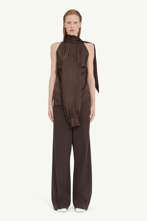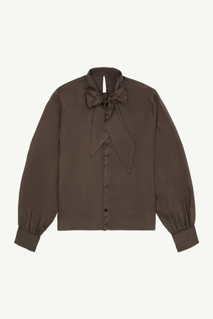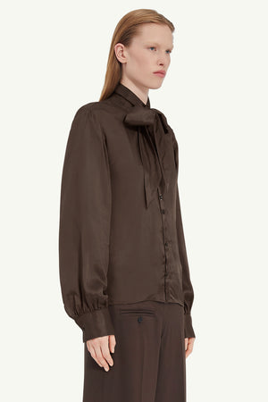 An elegant shirt that subverts conventional design with MM6's 90° twisted construction, offering striking angles and multifaceted styling. The adjustable bow at the neck adds a playful twist to its formal structure, while the buttoned cuffs and closure refine the overall look. At the back, the white stitch line highlights the Maison's signature.