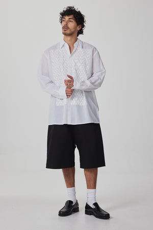 ● Drop crotched over-the-knee shorts in a sculptural cotton/spandex blend