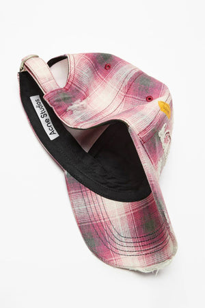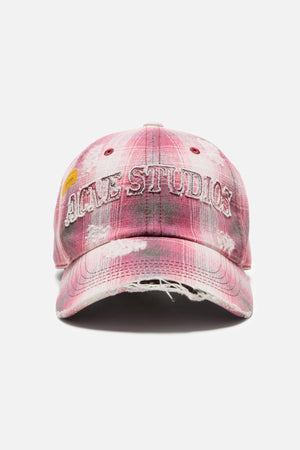 Baseball cap features a check pattern and logo artwork and distressed details. Complete with an adjustable D-ring closure.